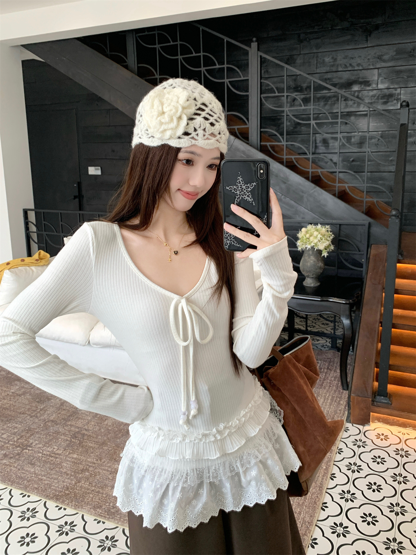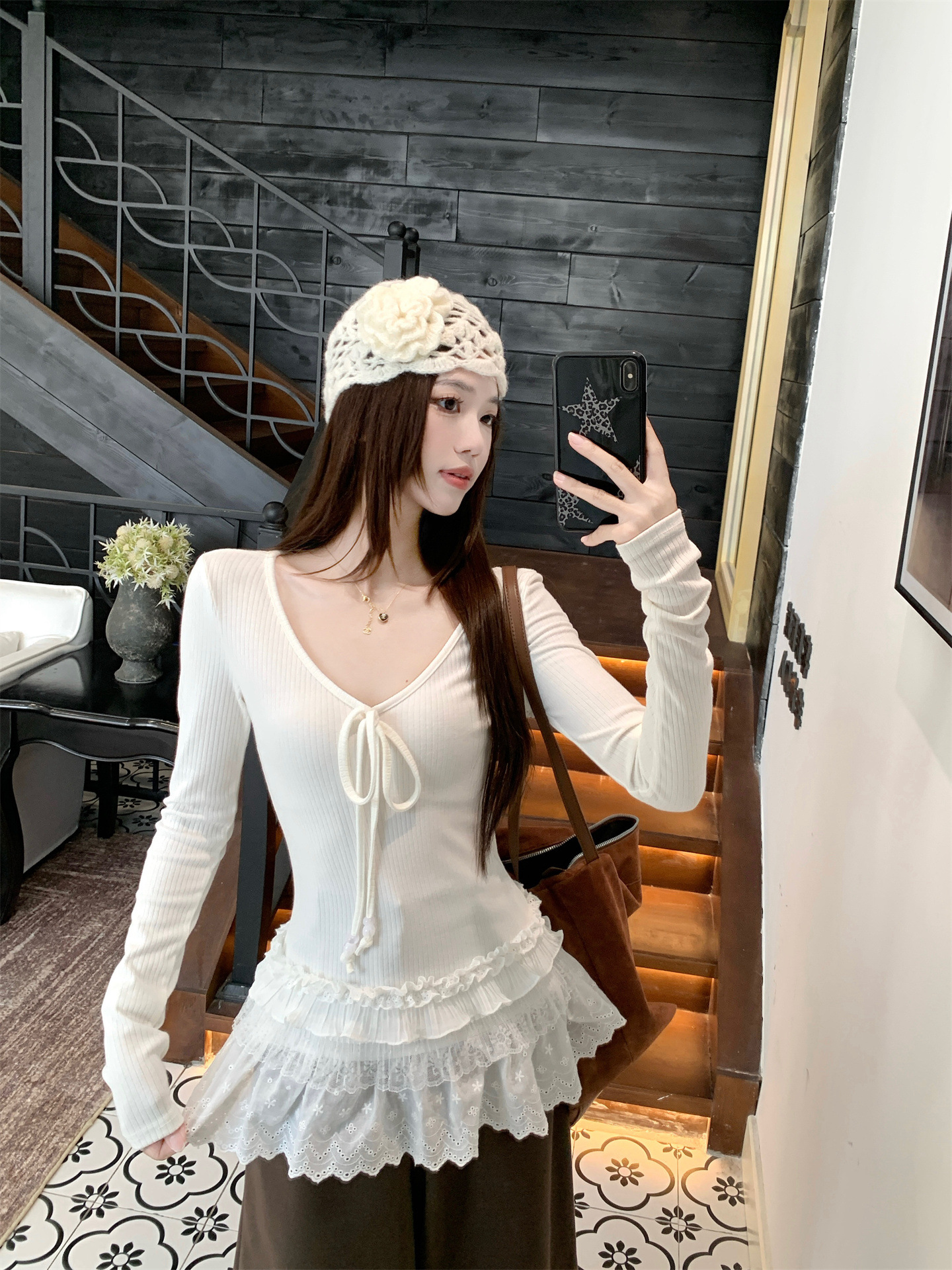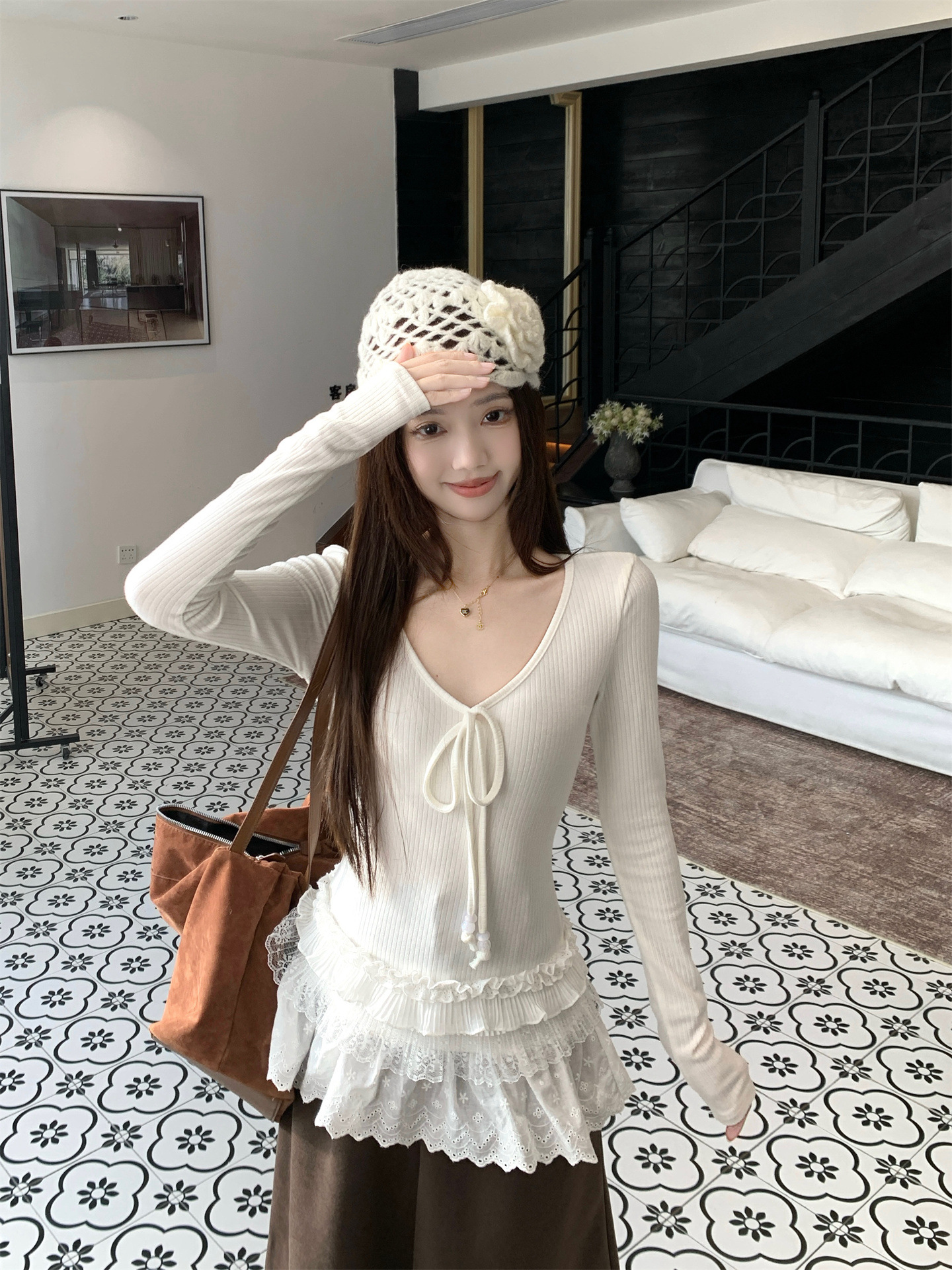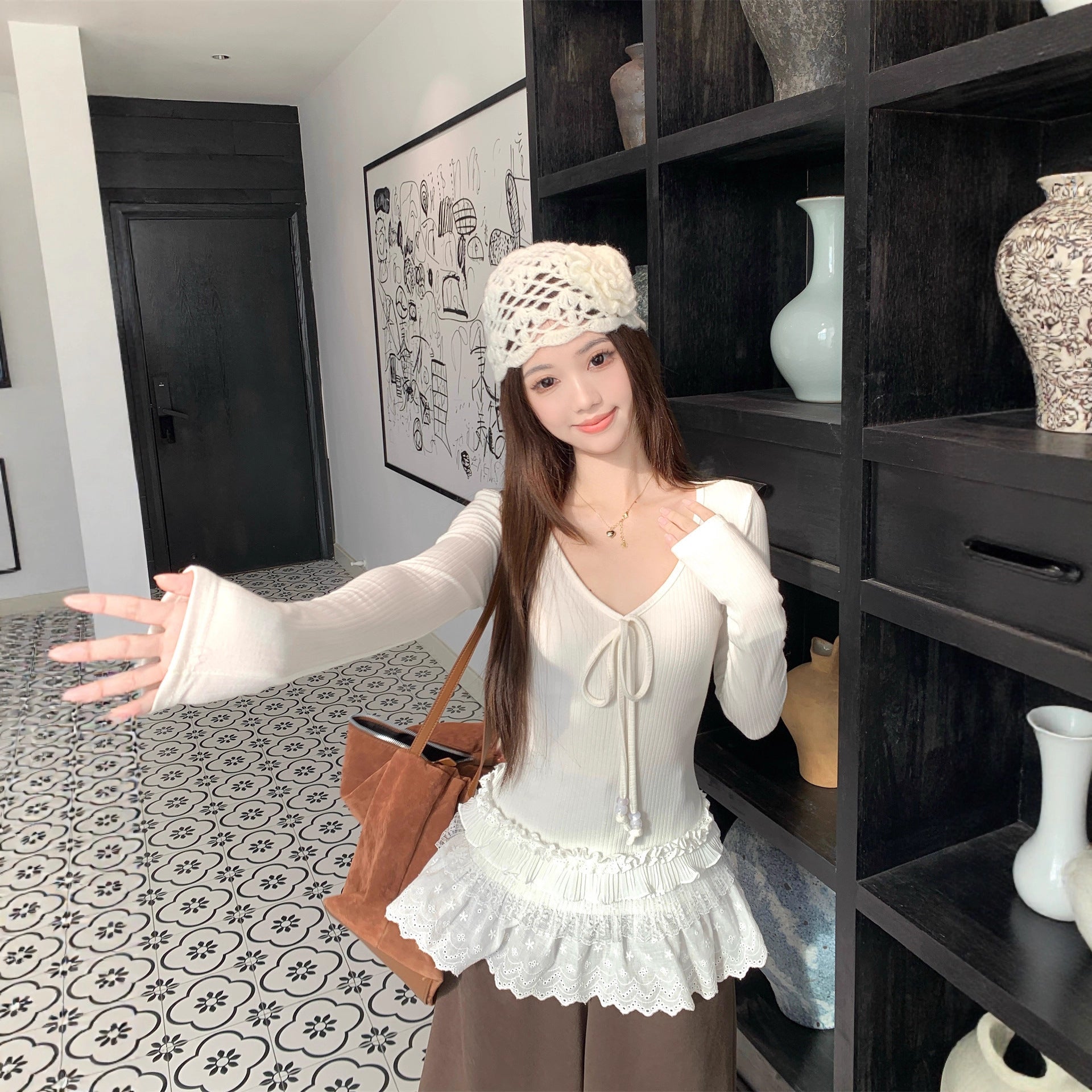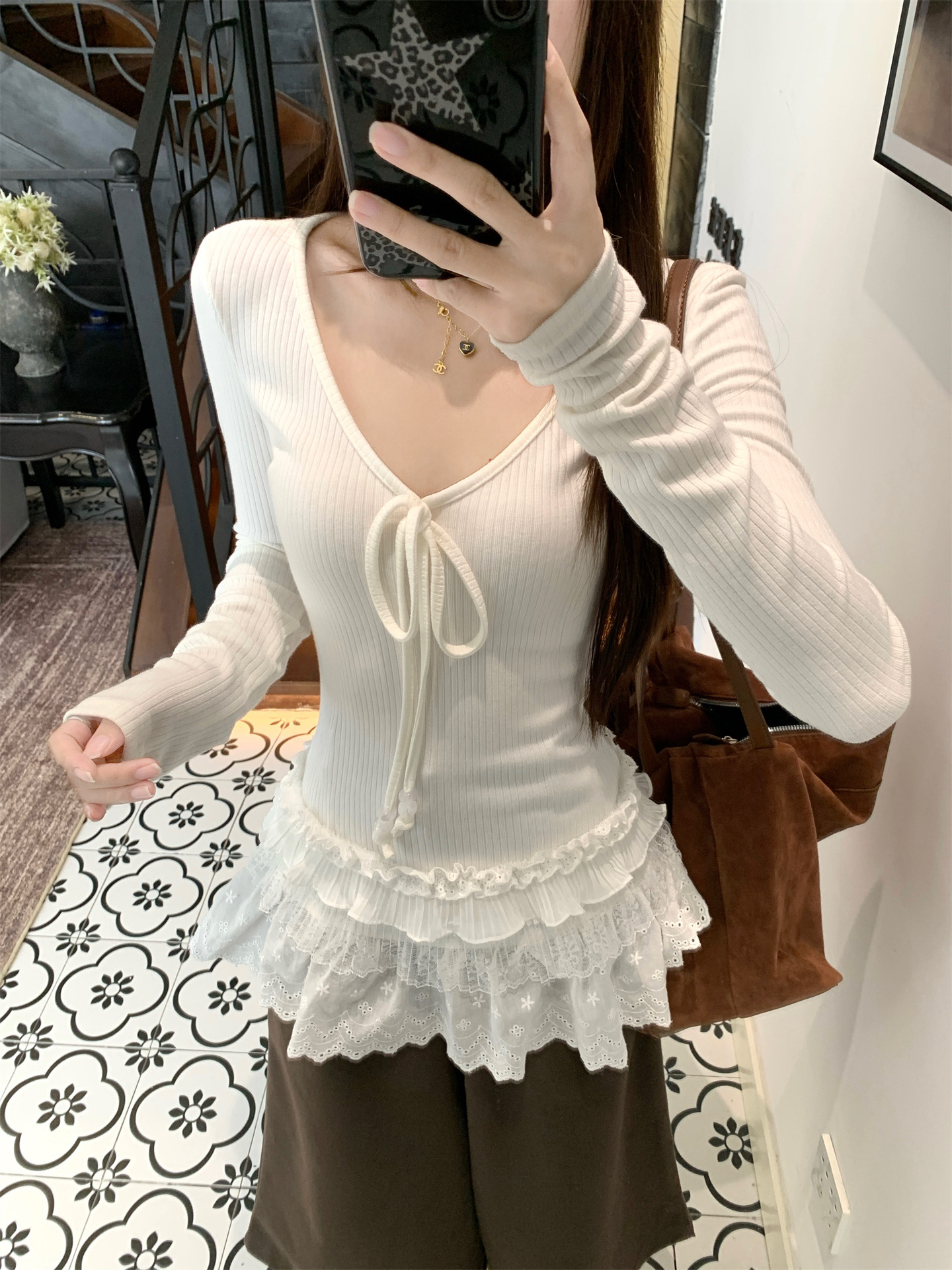 Spliced V-neck Tie Long Sleeve Women's Versatile Slimming Top